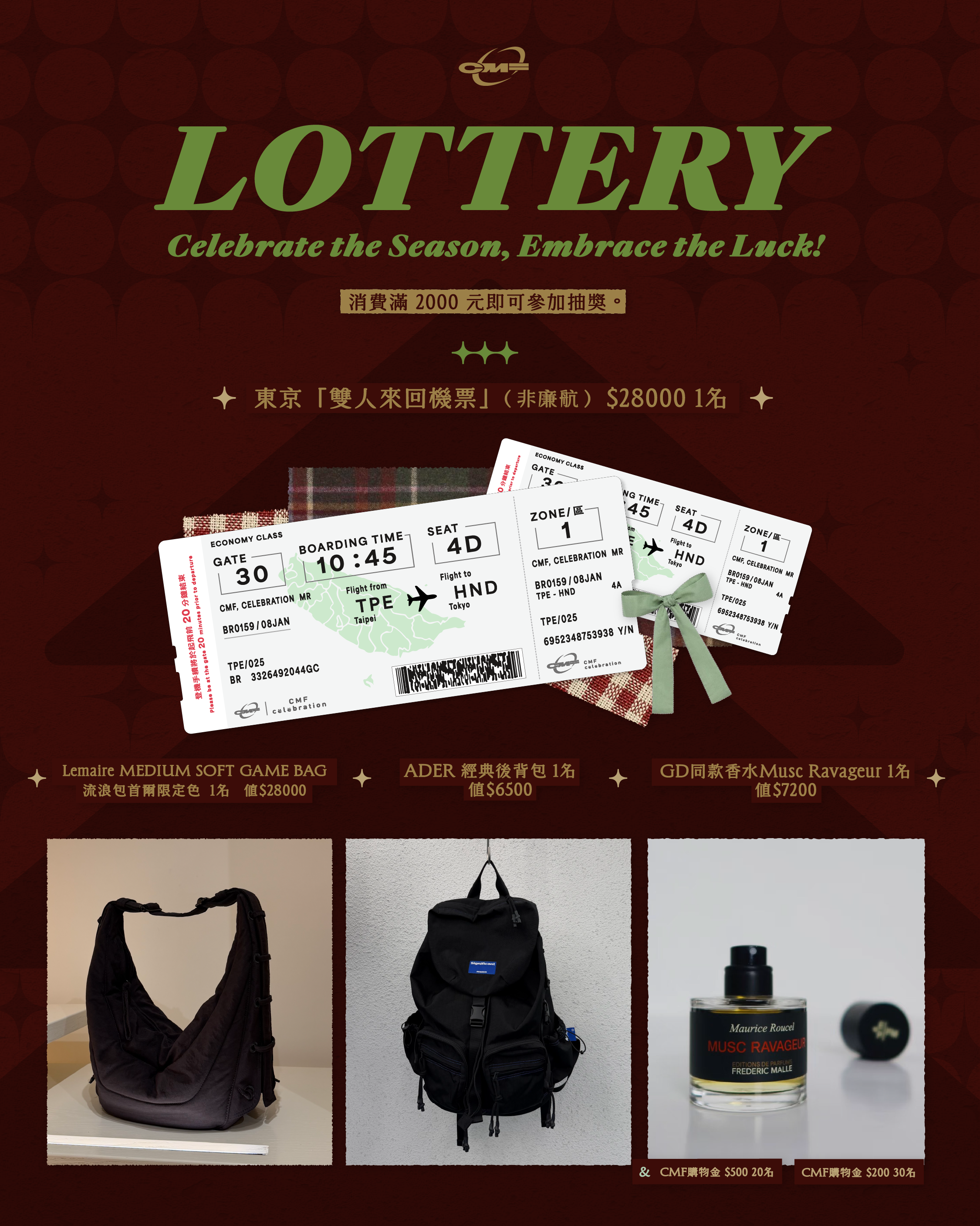🎄每年必備最重要回饋活動,下單抽耶誕禮 開跑 / 新朋友 [ 註冊登錄 ] 送 50元 購物金 / CMF 官方LINE 新開張 @cmf.celebration / 抽 東京雙人來回機票✈️✈️/網路下單網路下單滿兩千由小幫手代寫摸彩券