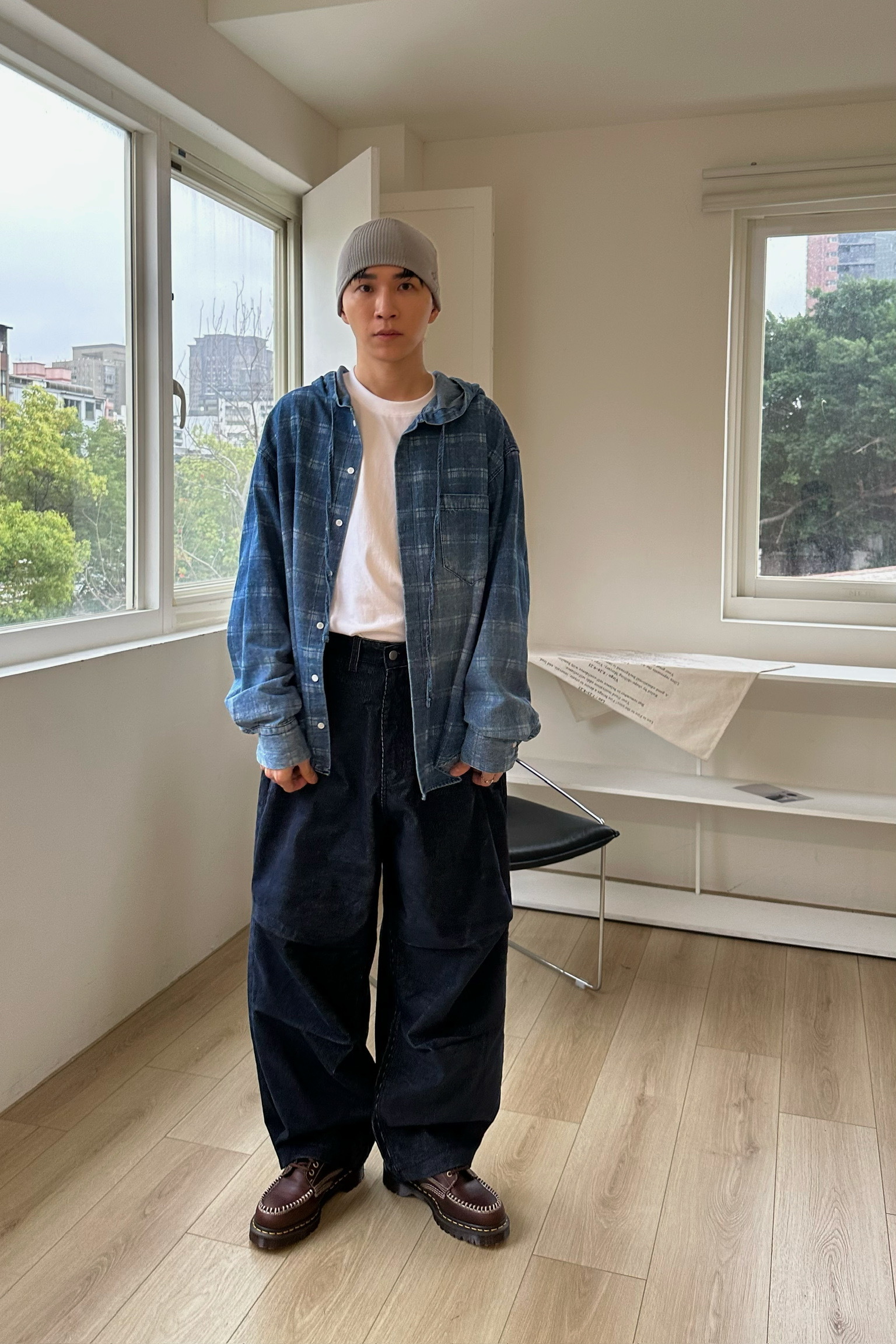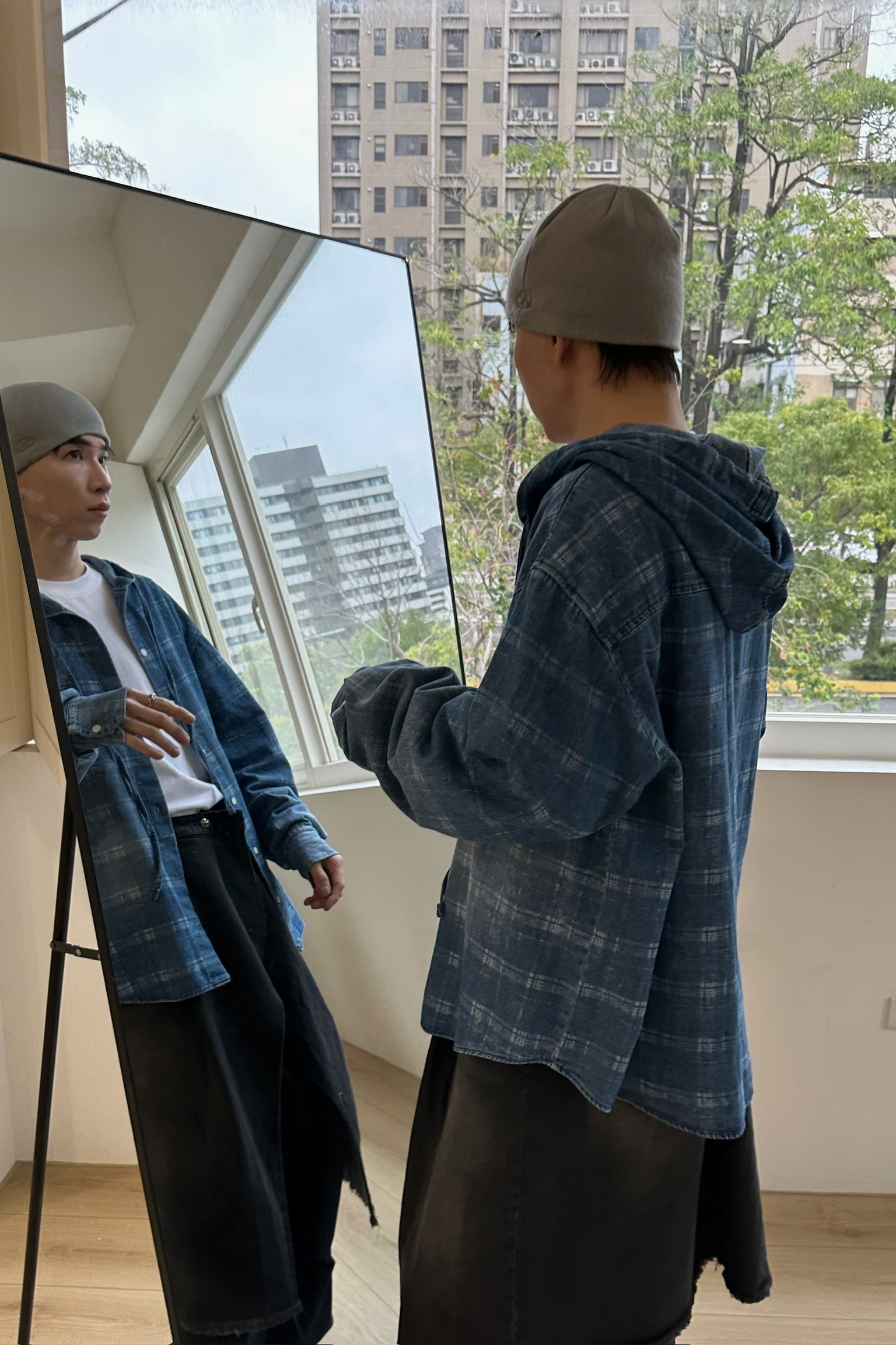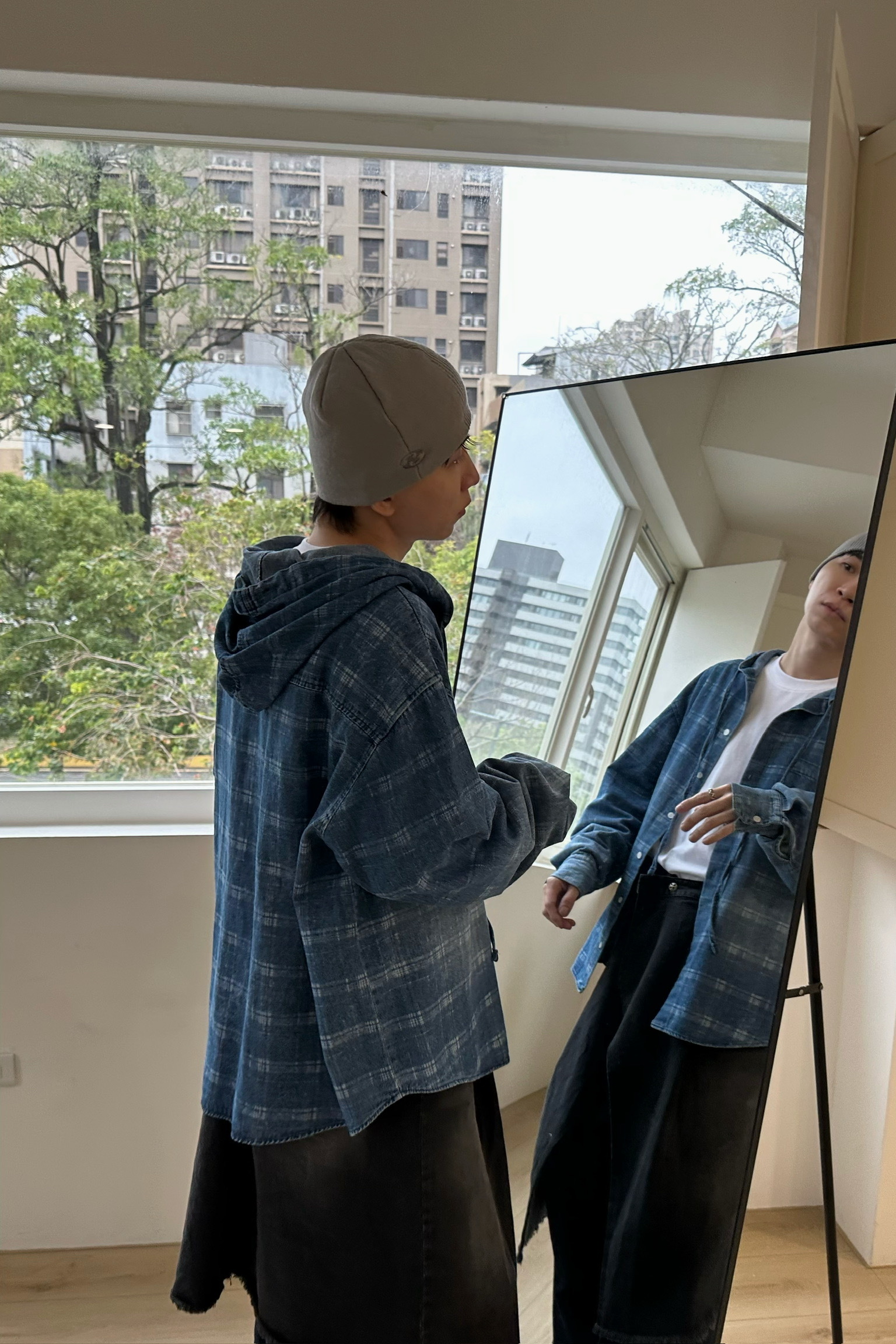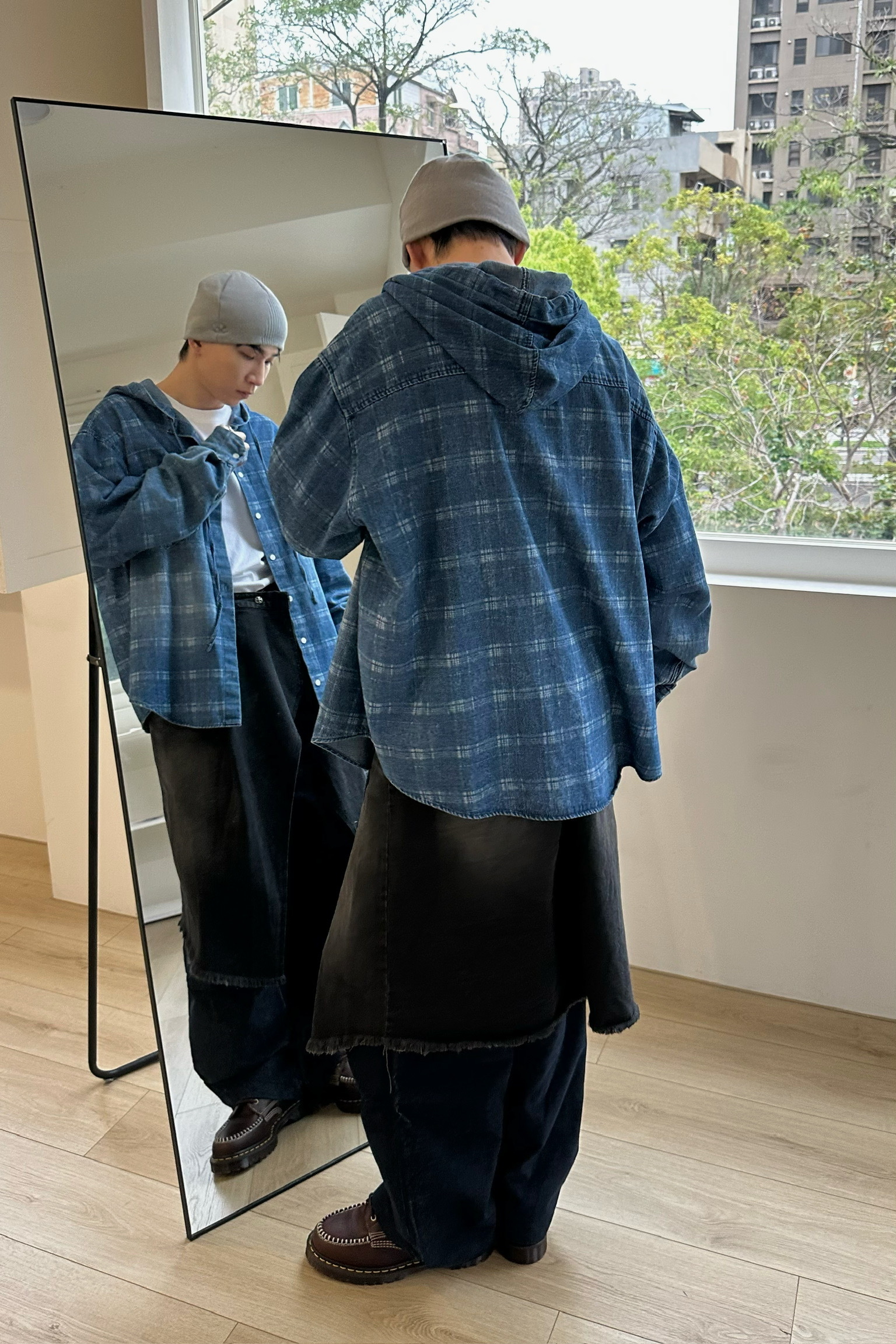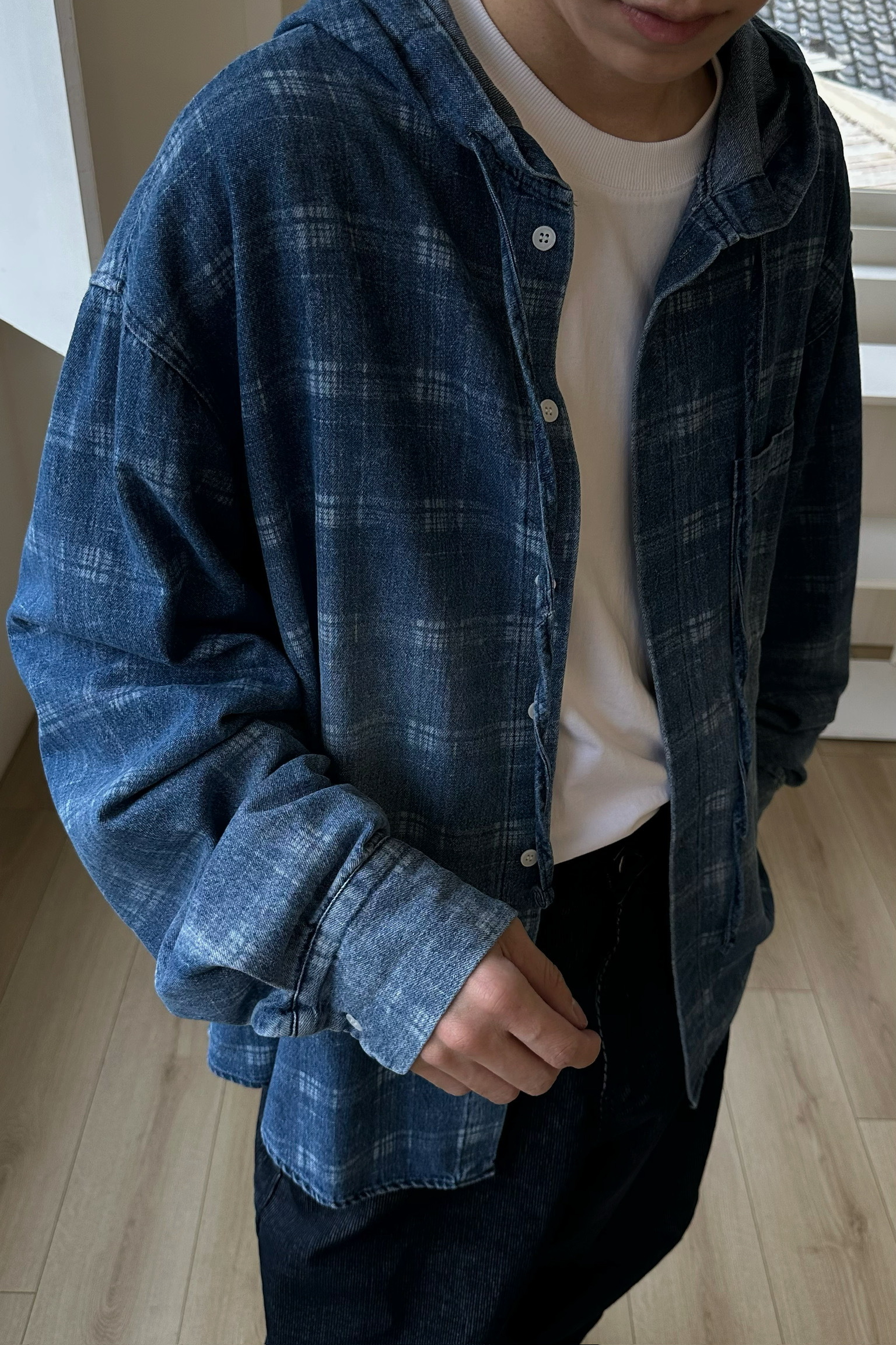 刷白格紋連帽牛仔襯衫