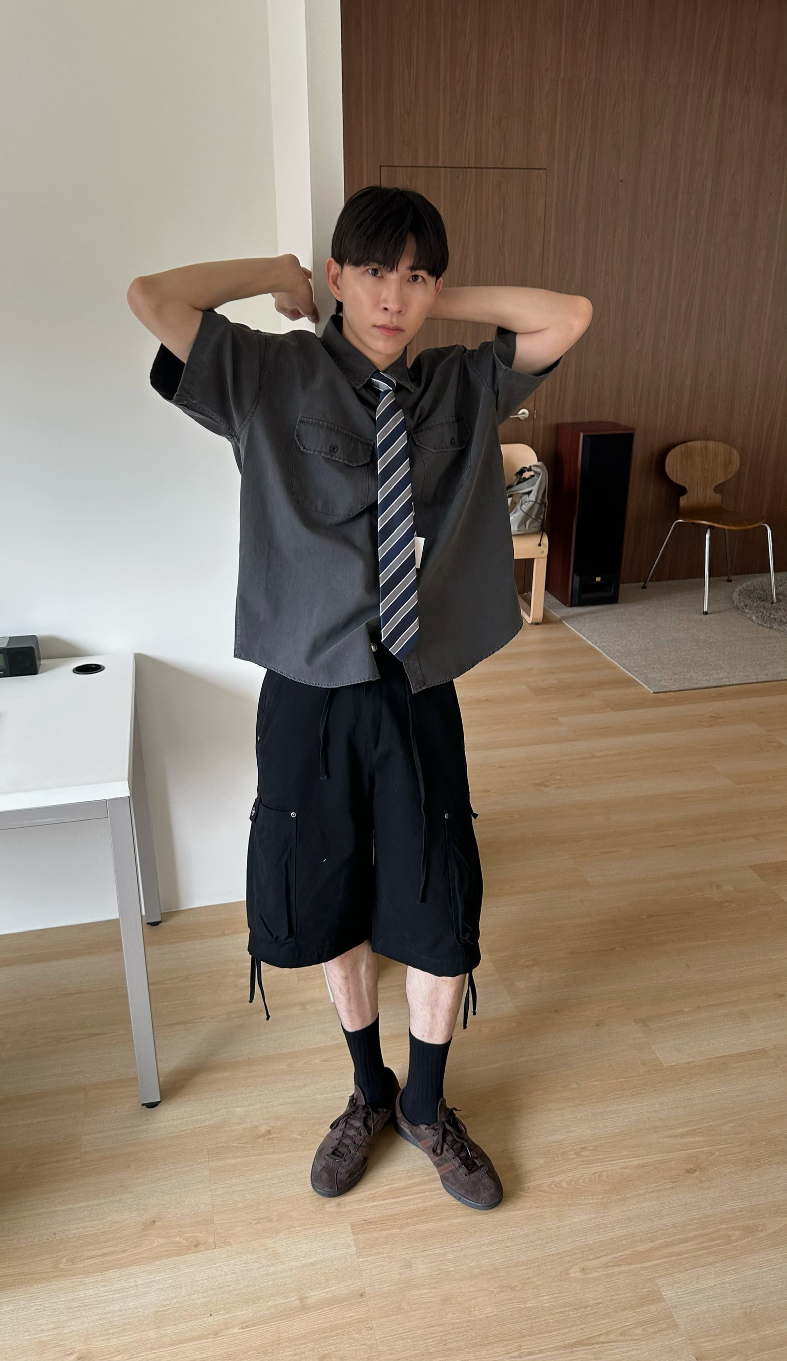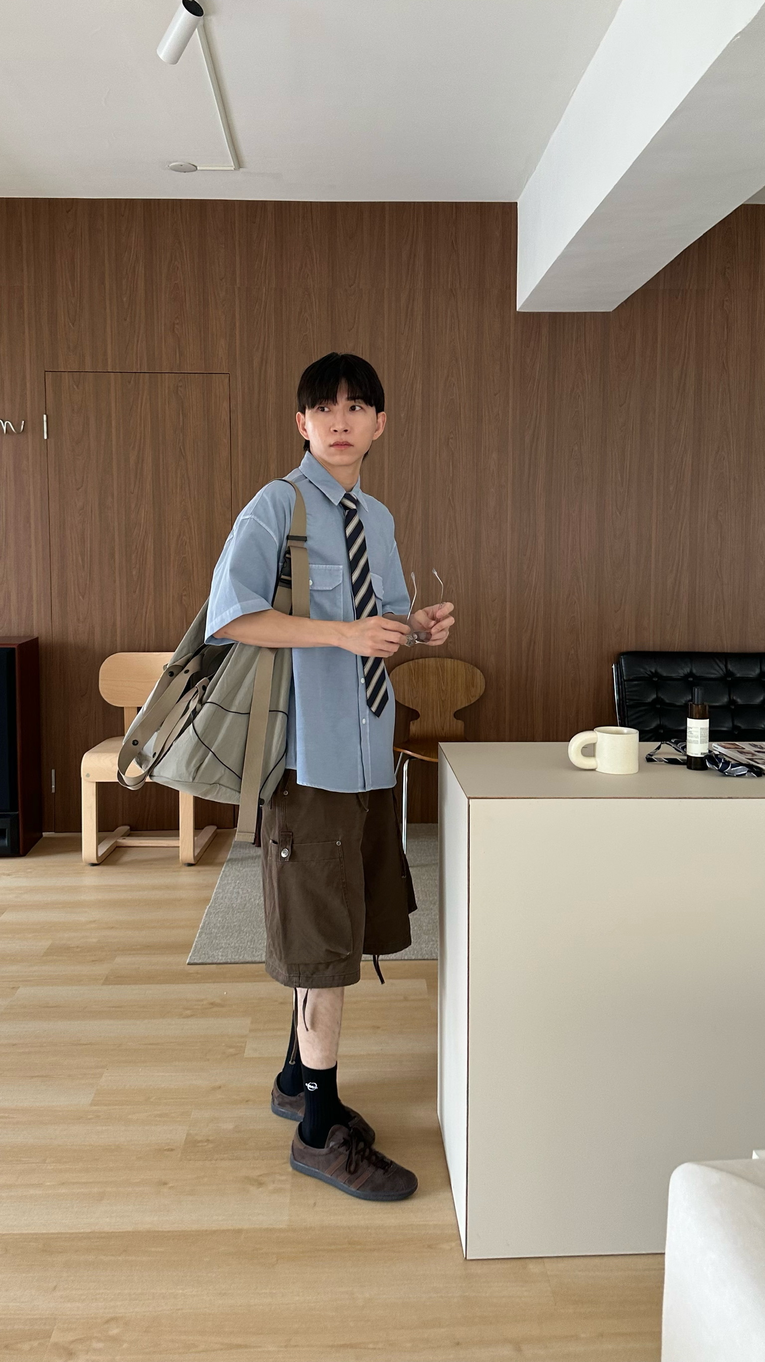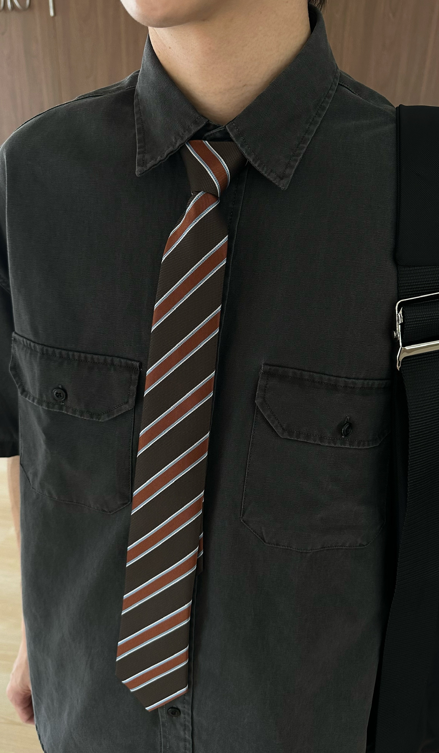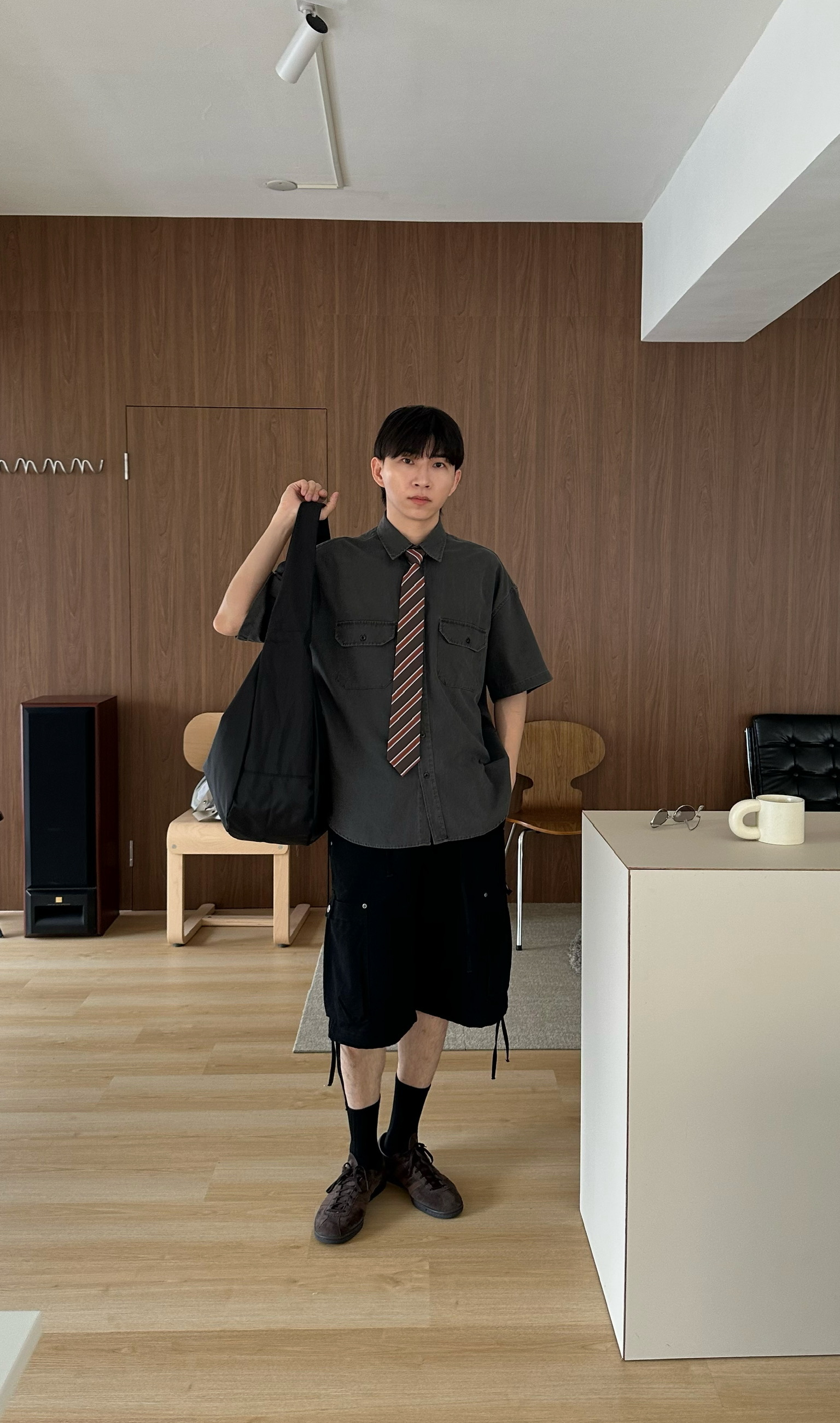 這款領帶帶有復古學院感,搭配短袖襯衫與工作短褲,又有一種鬆弛的反差帥感