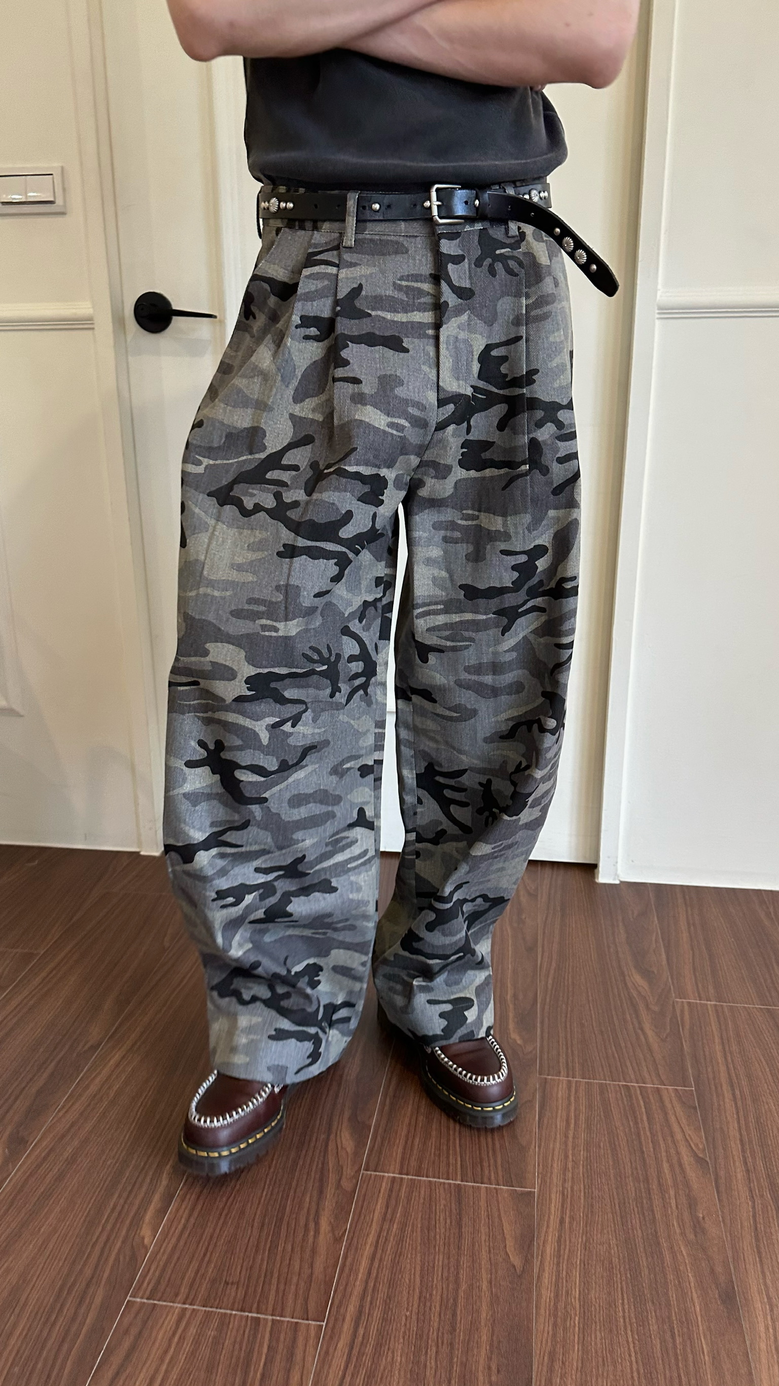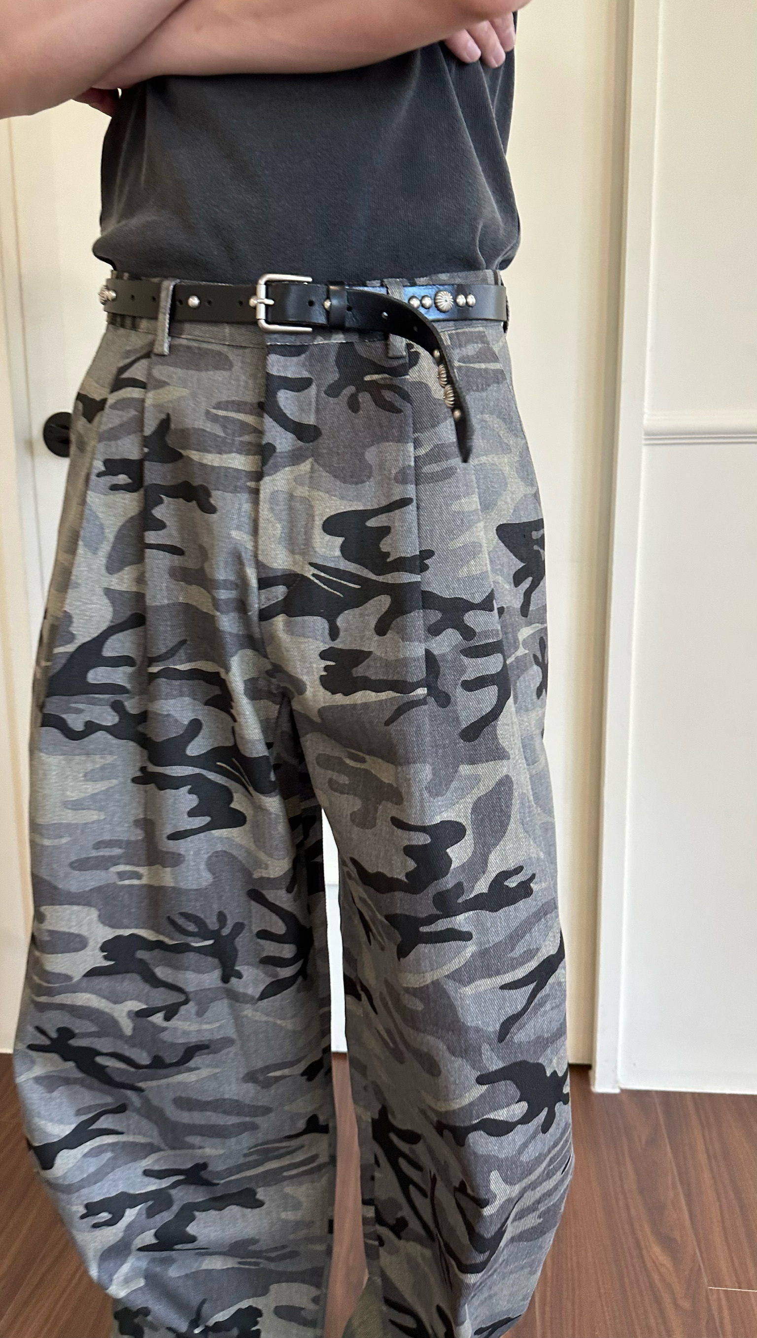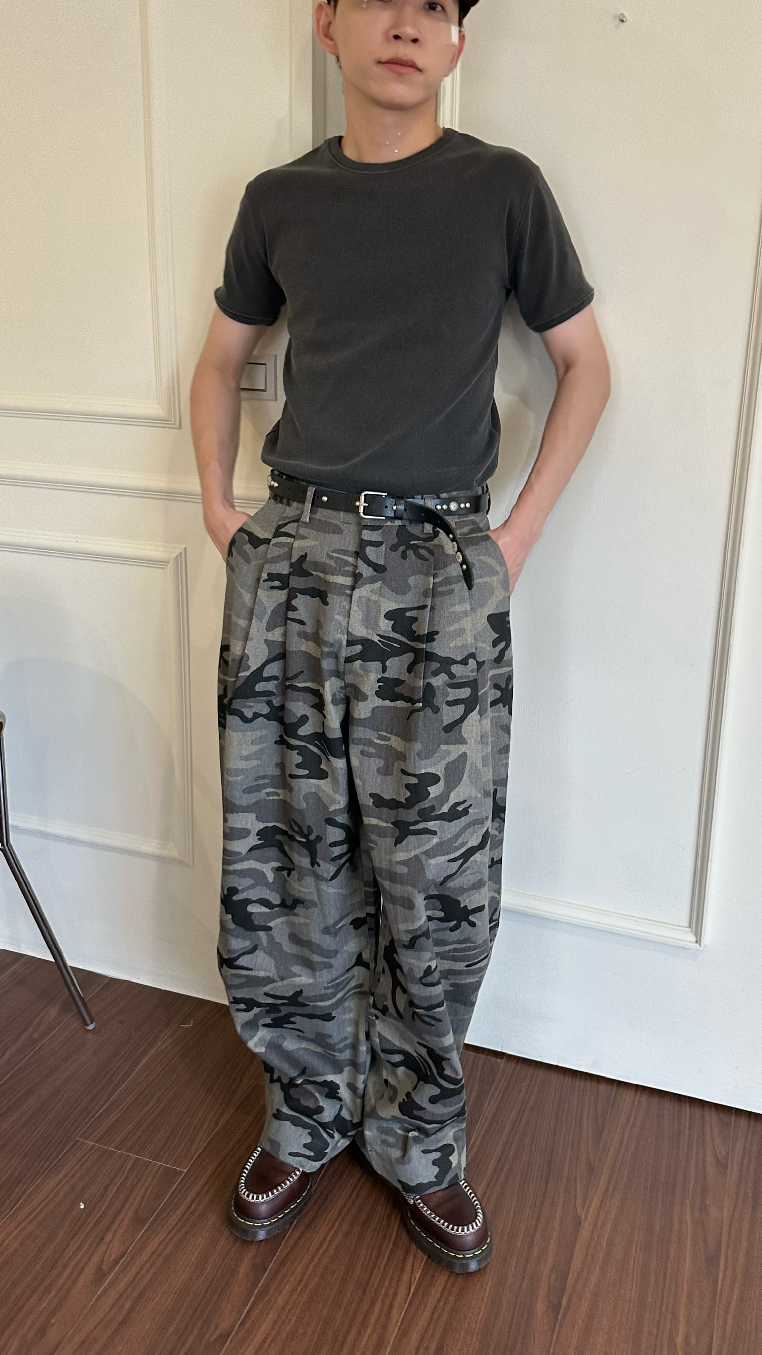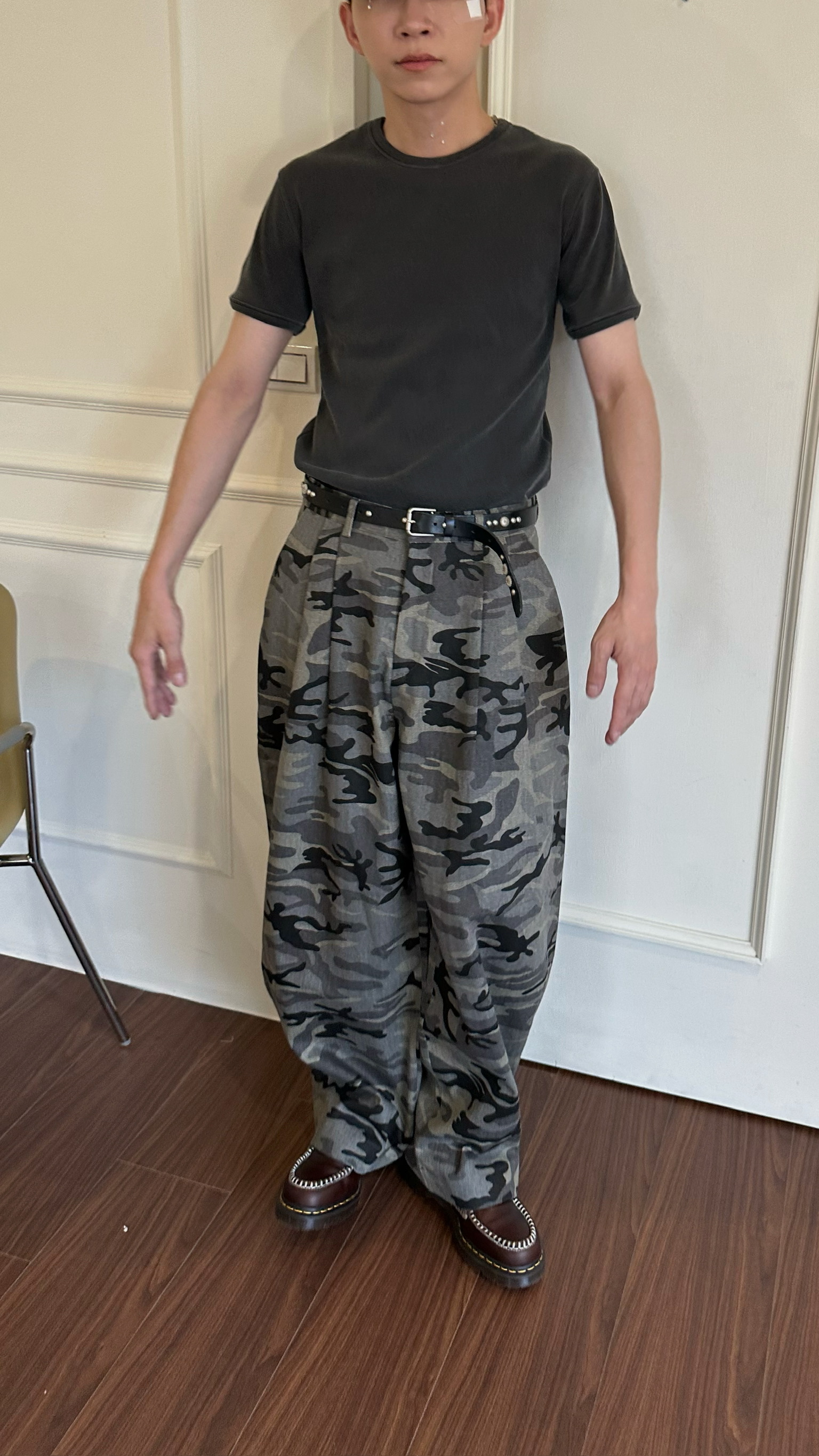 迷彩紋路製作西裝褲的雙折剪裁