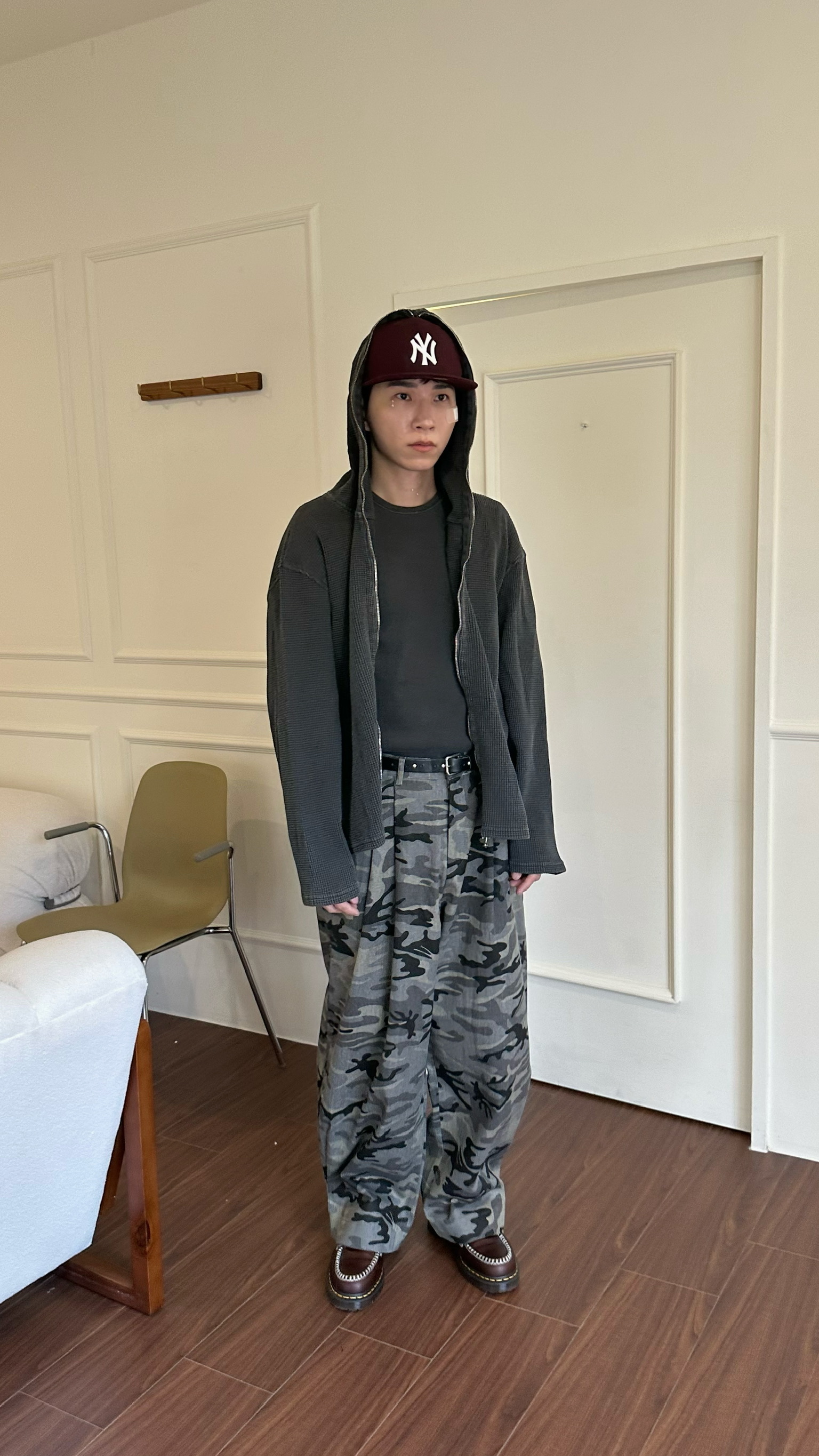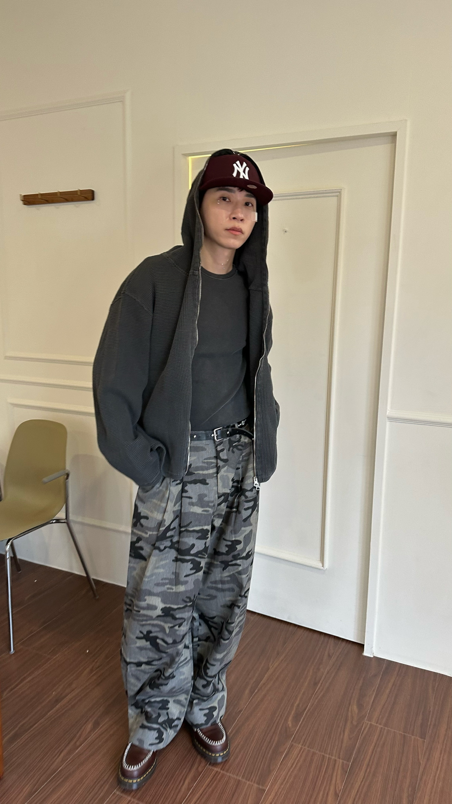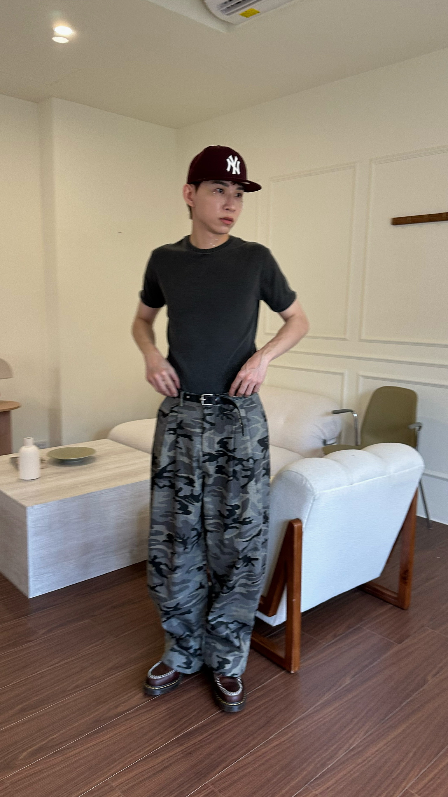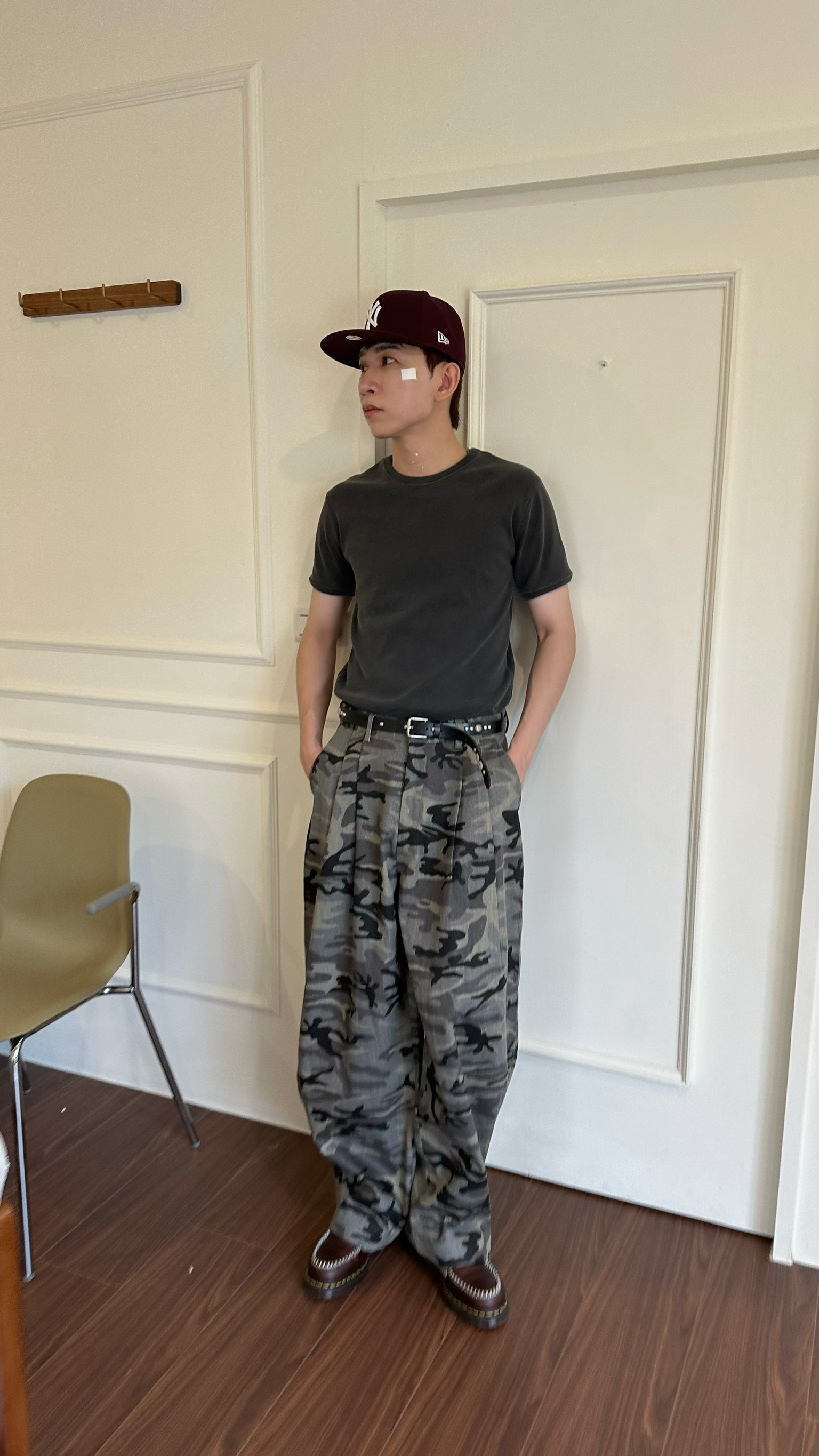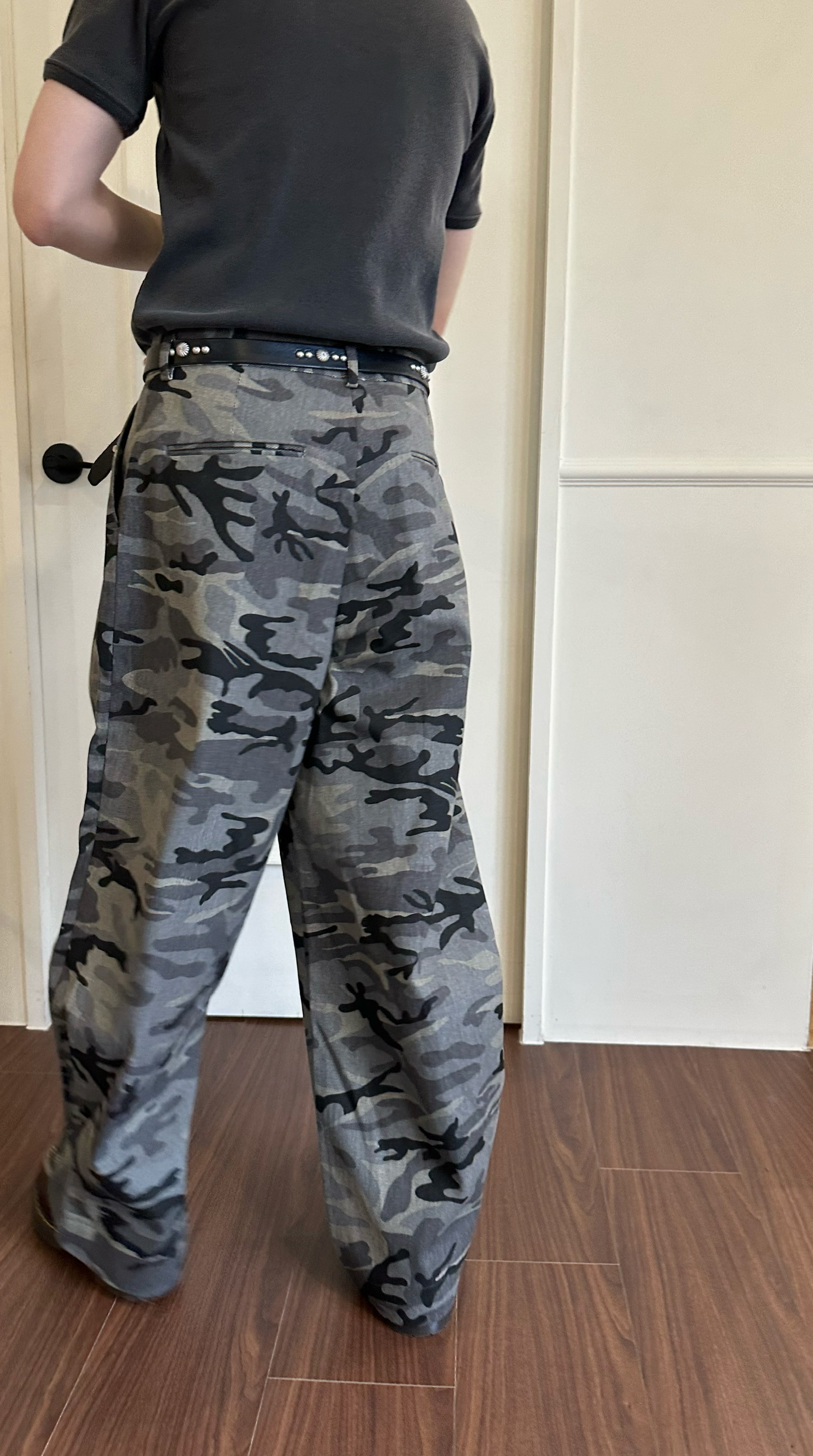 迷彩紋路製作西裝褲的雙折剪裁