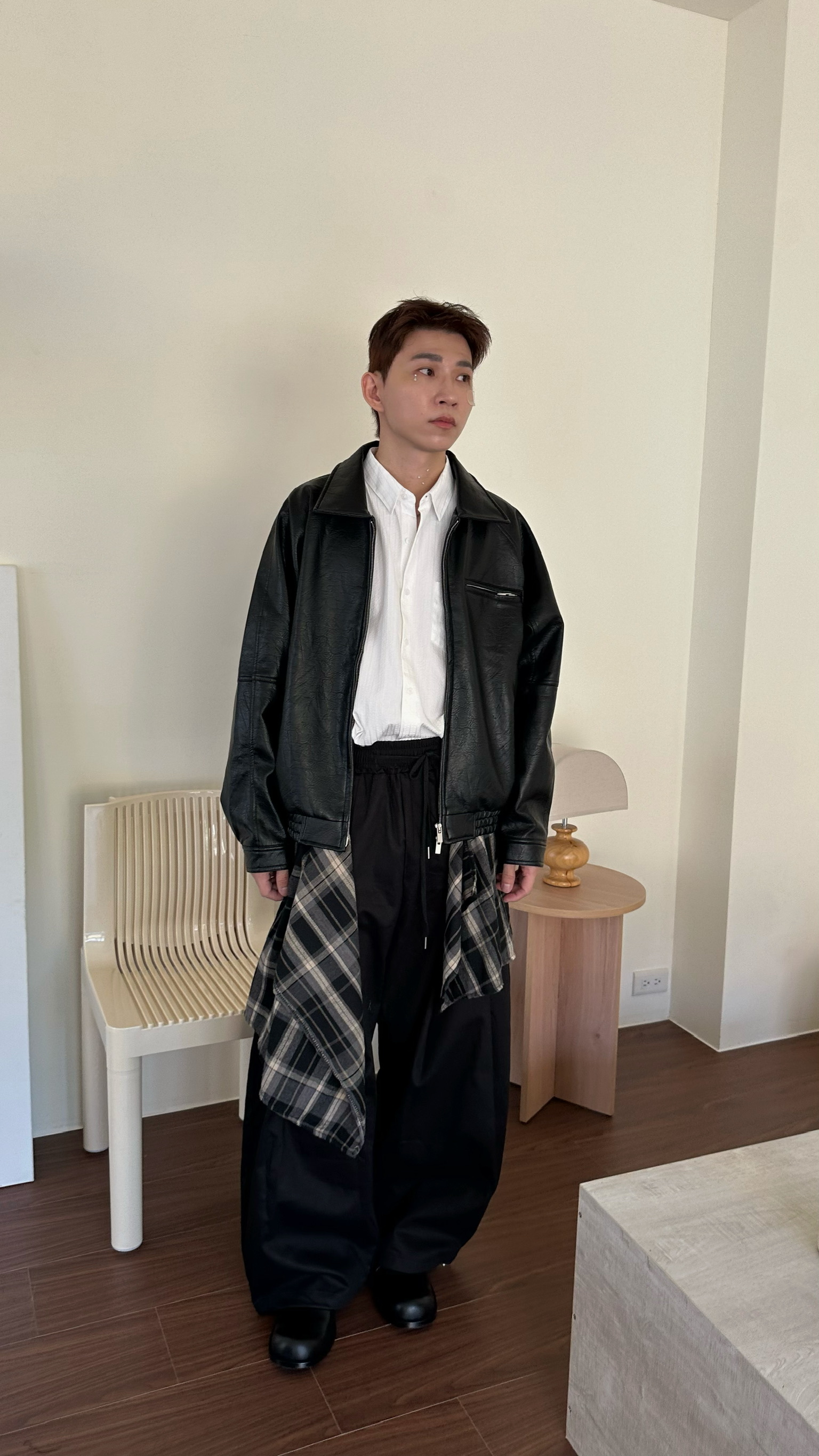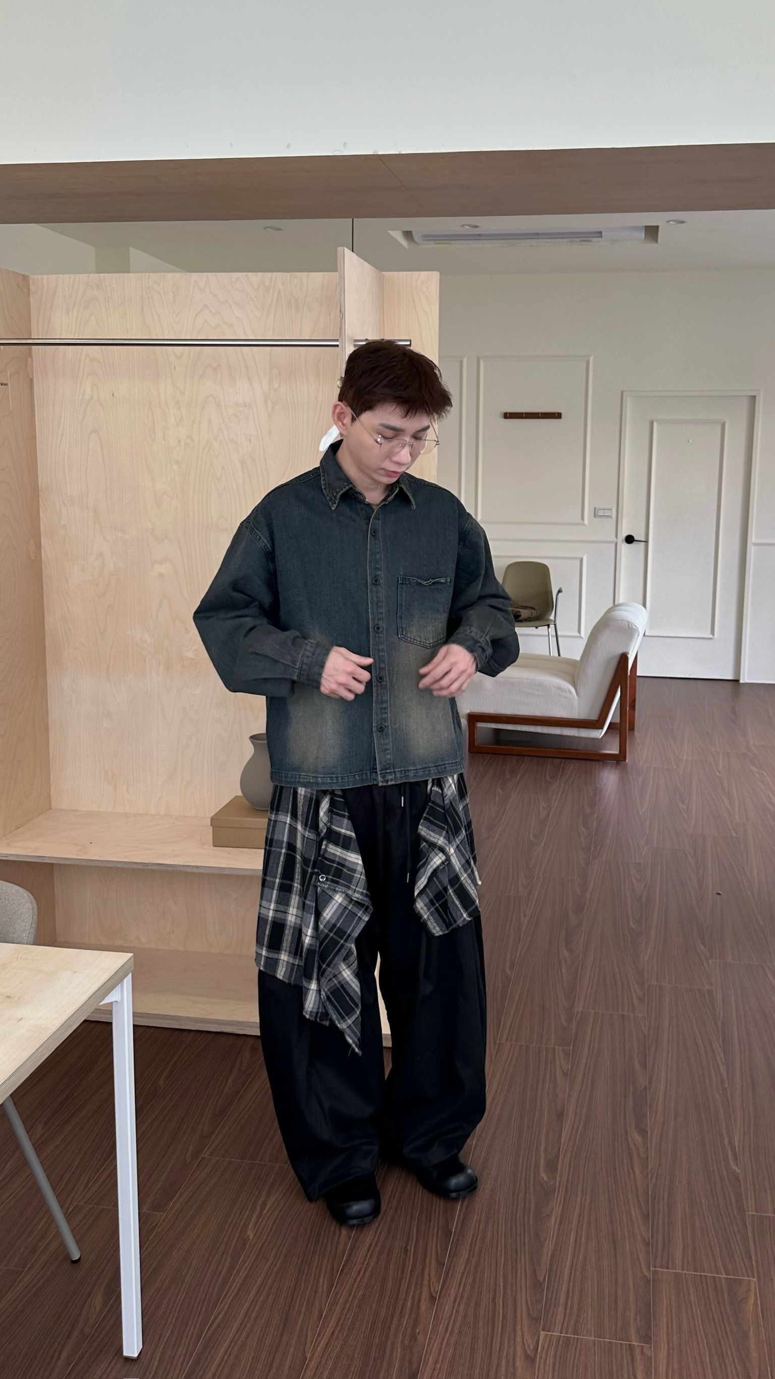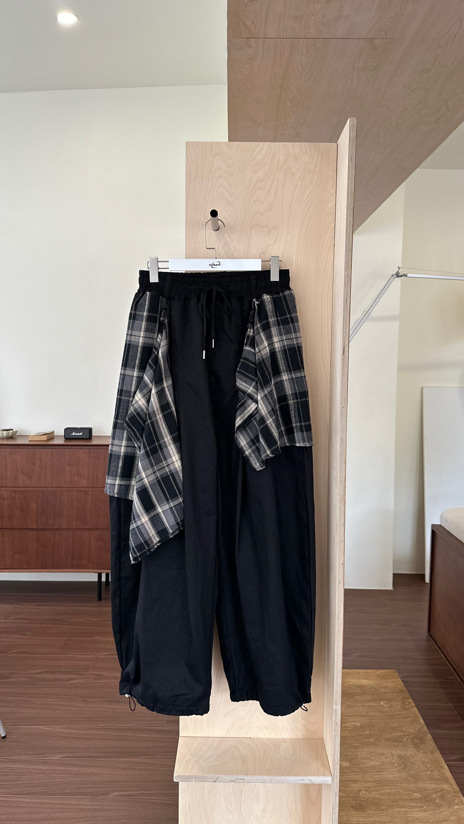 兩件式格紋拼布闊腿褲