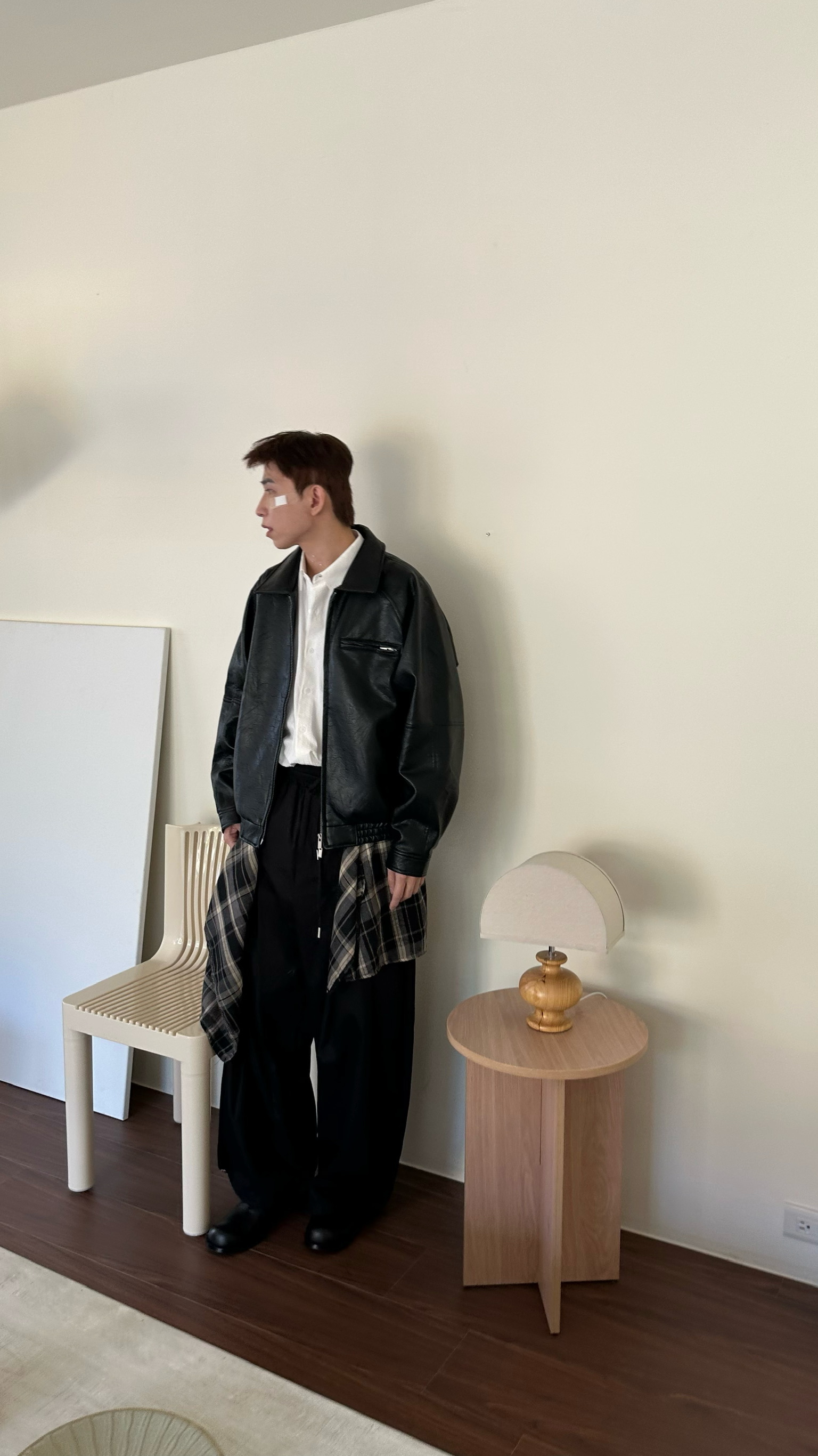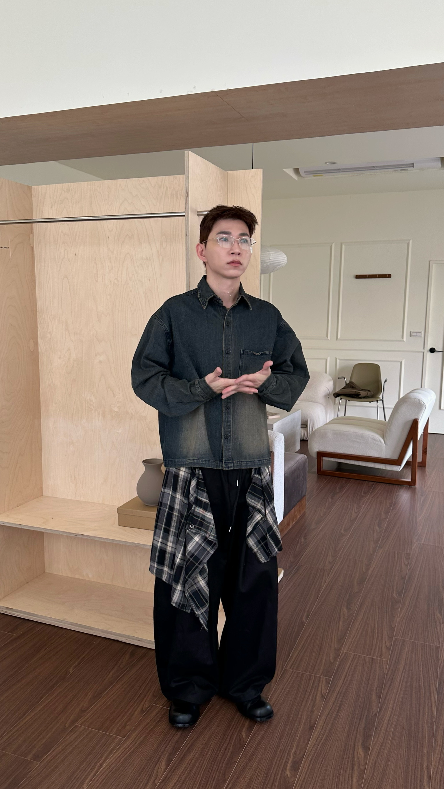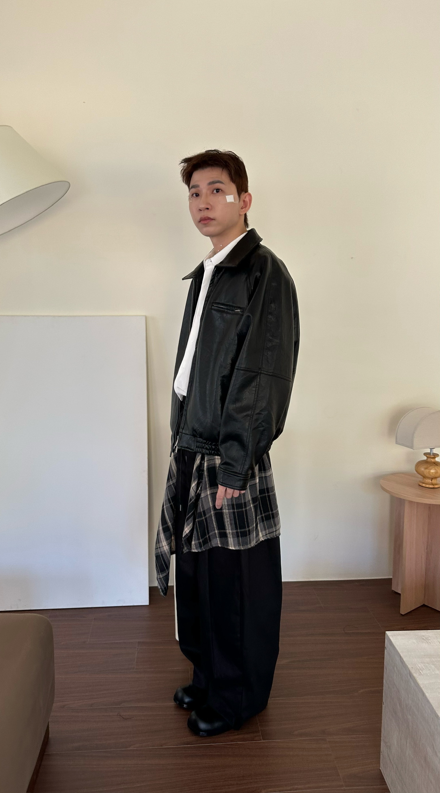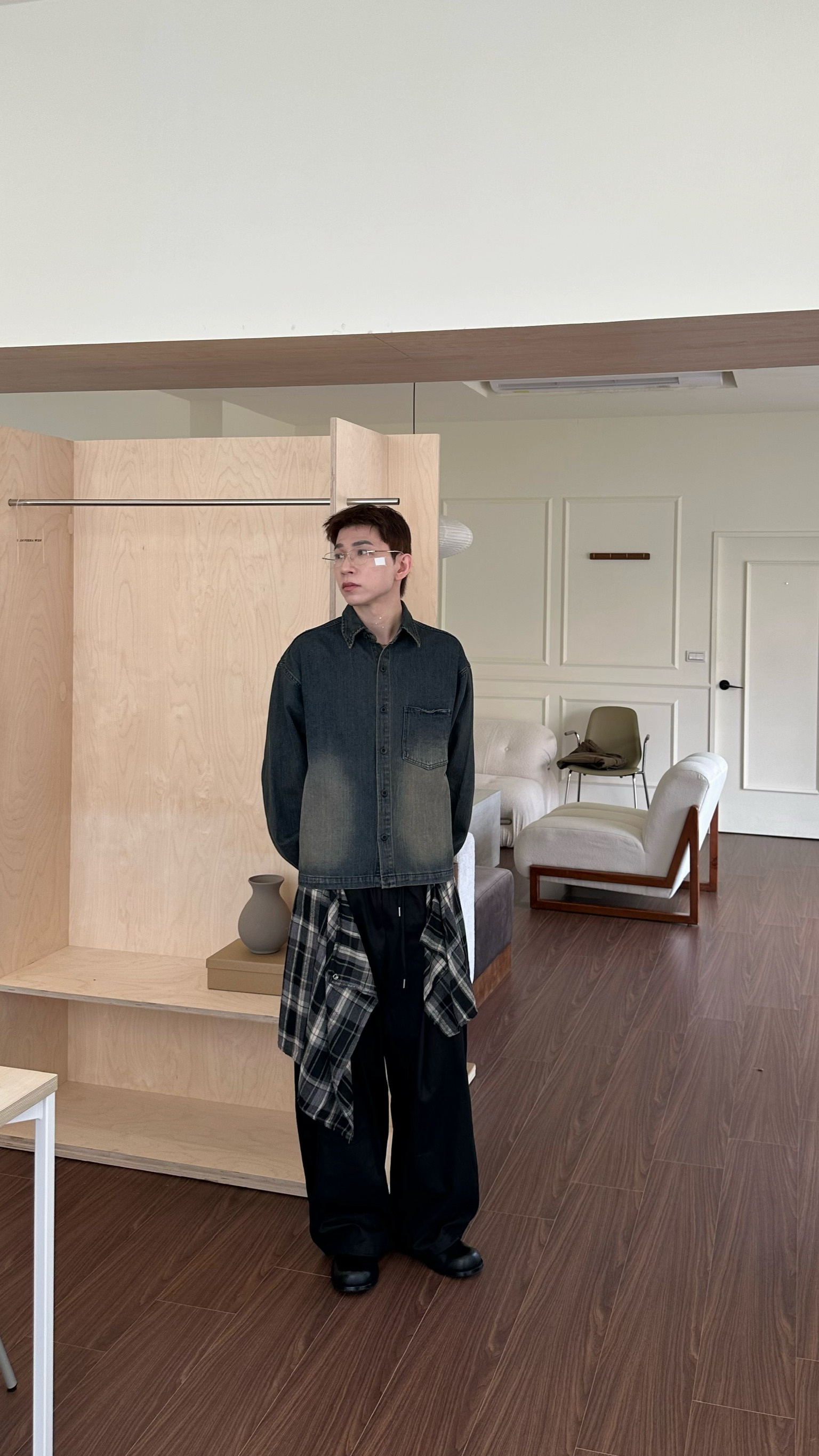 兩件式格紋拼布闊腿褲