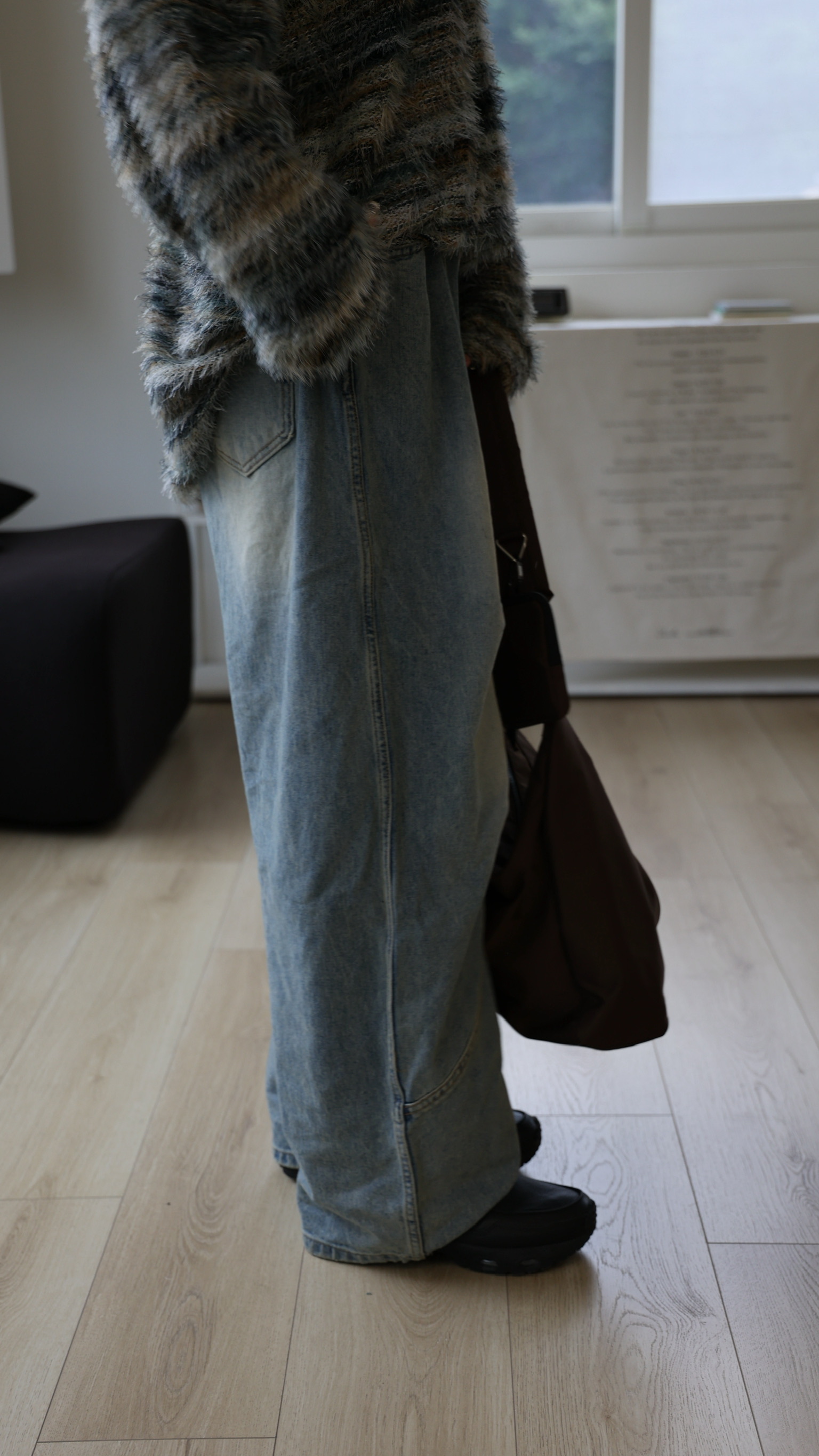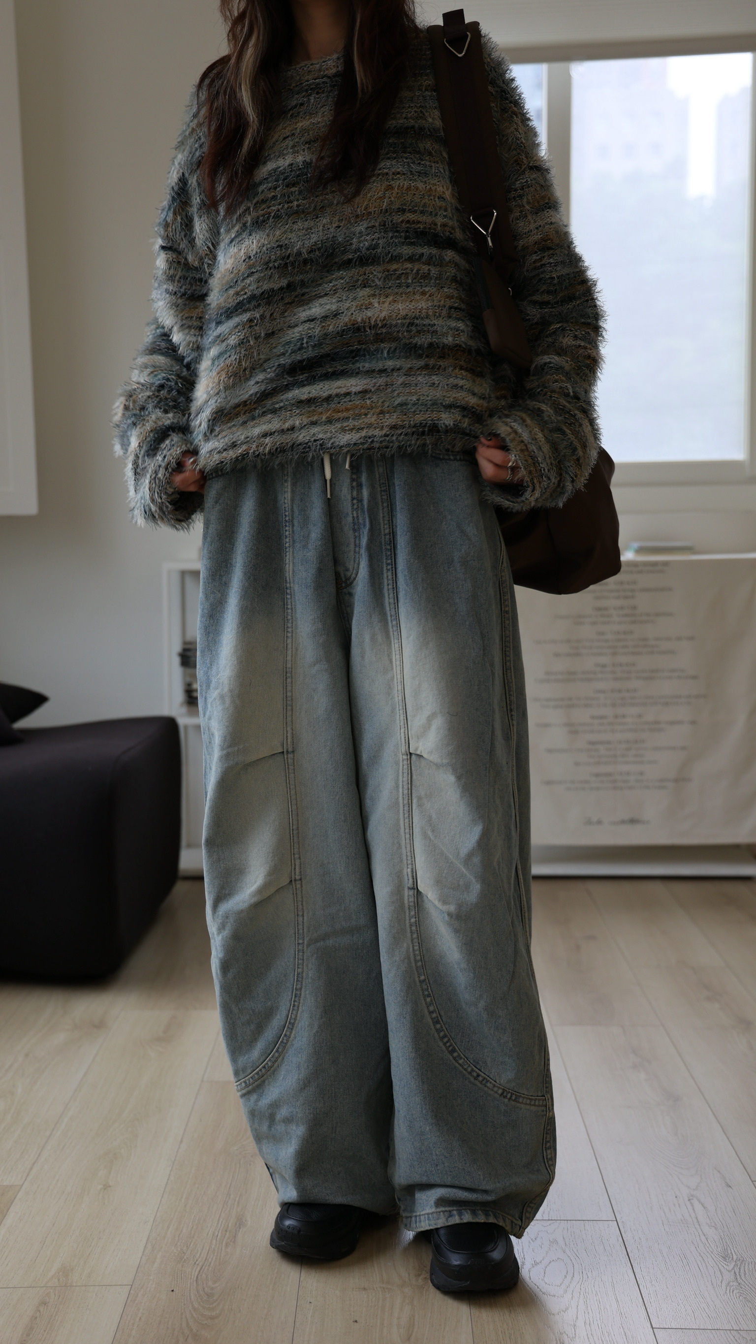 鬆緊側抓皺弧線牛仔褲