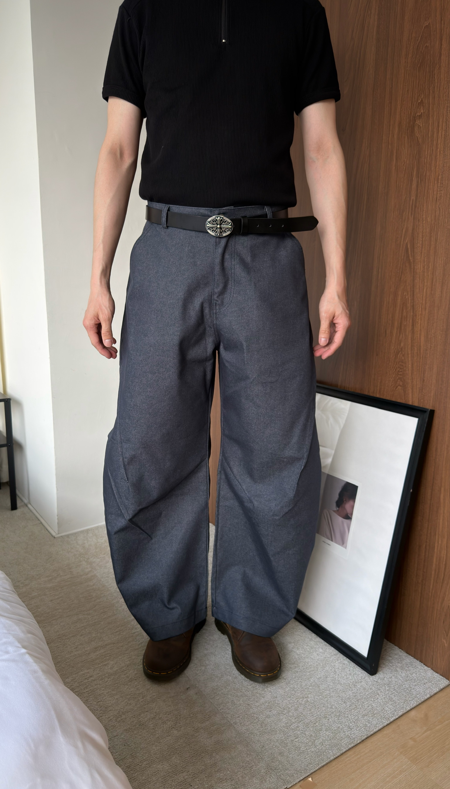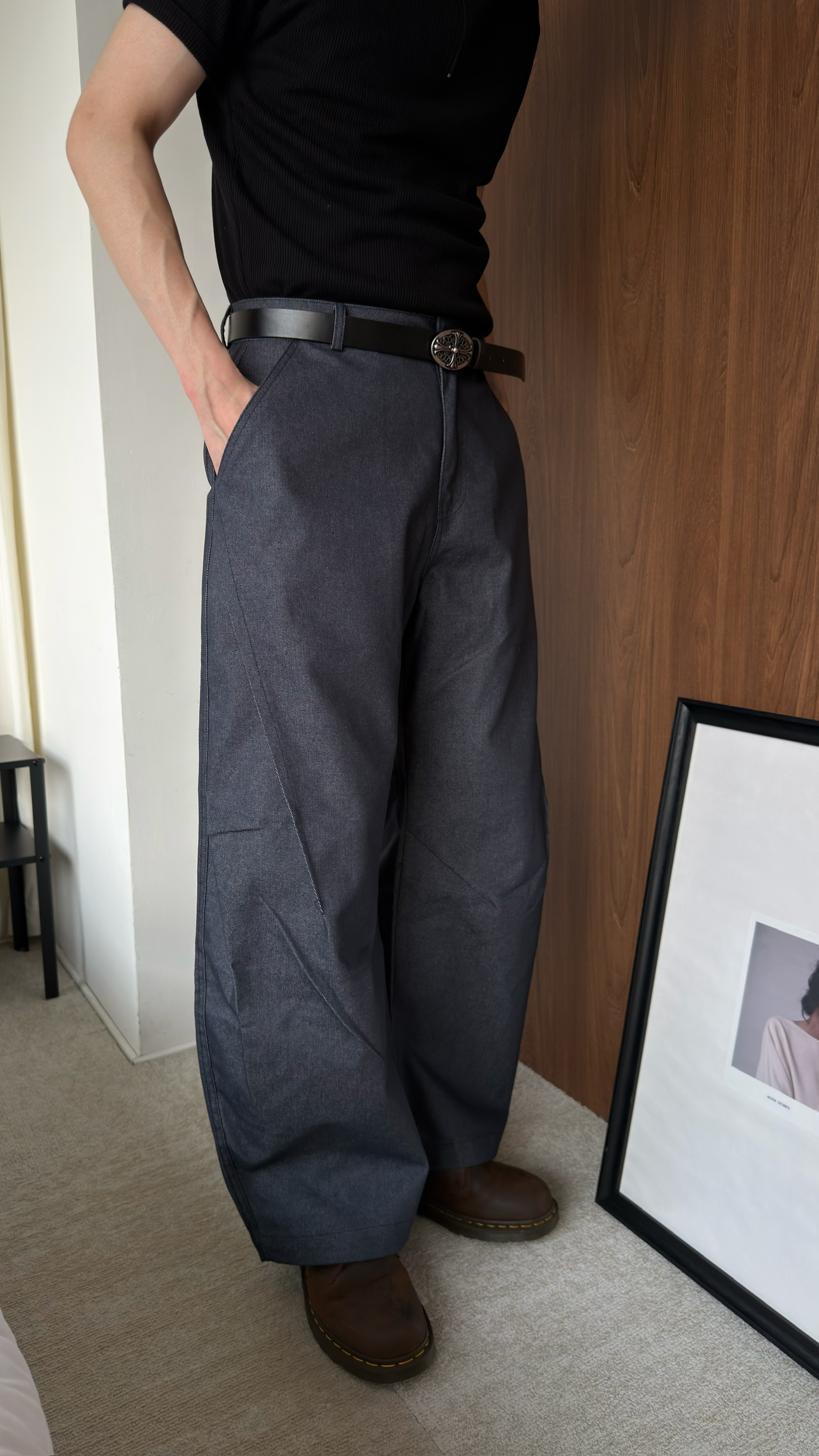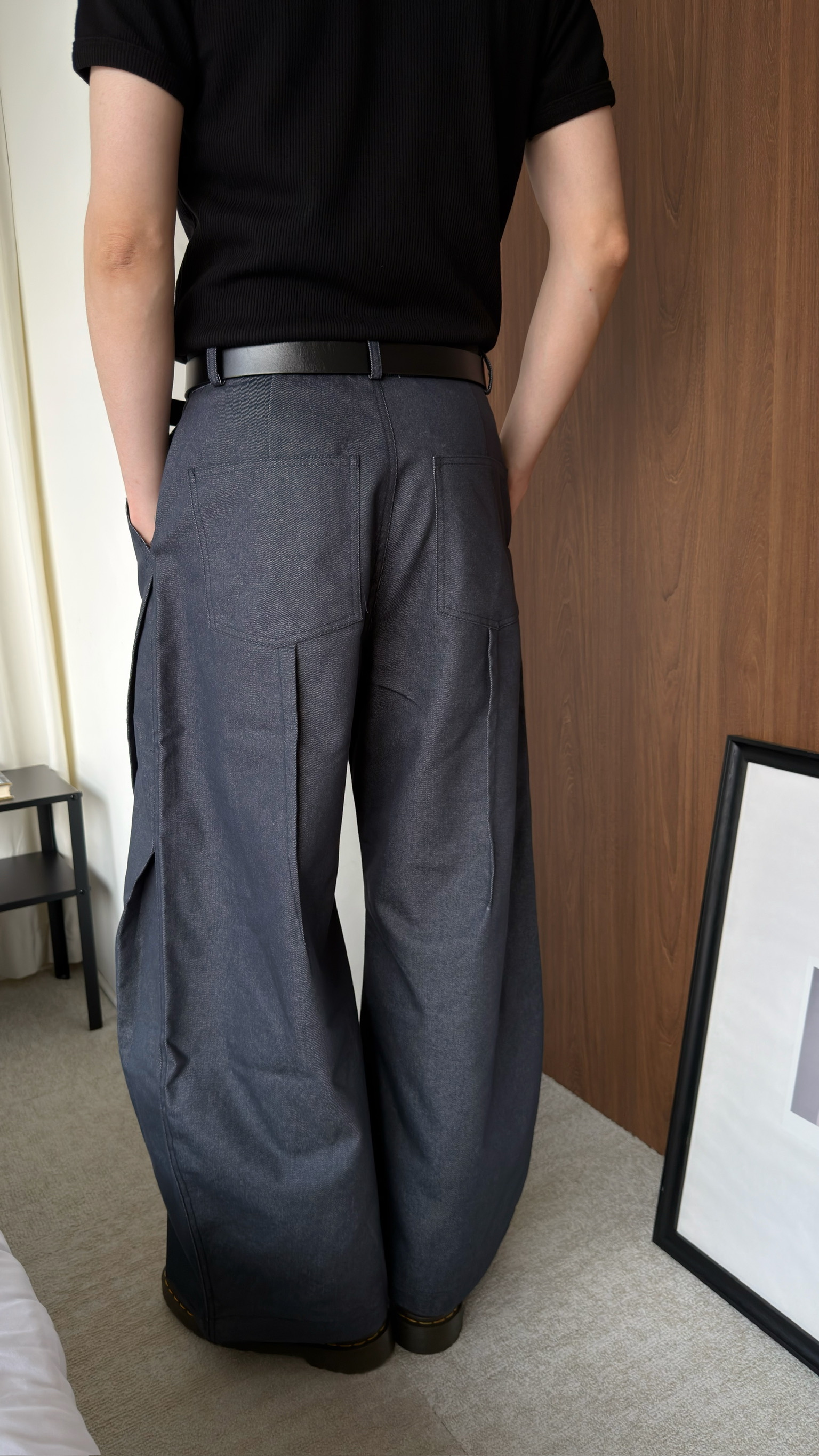 闊腿側立體抓皺丹寧褲