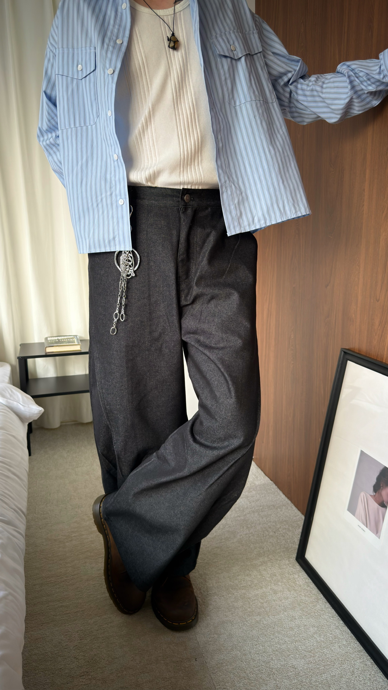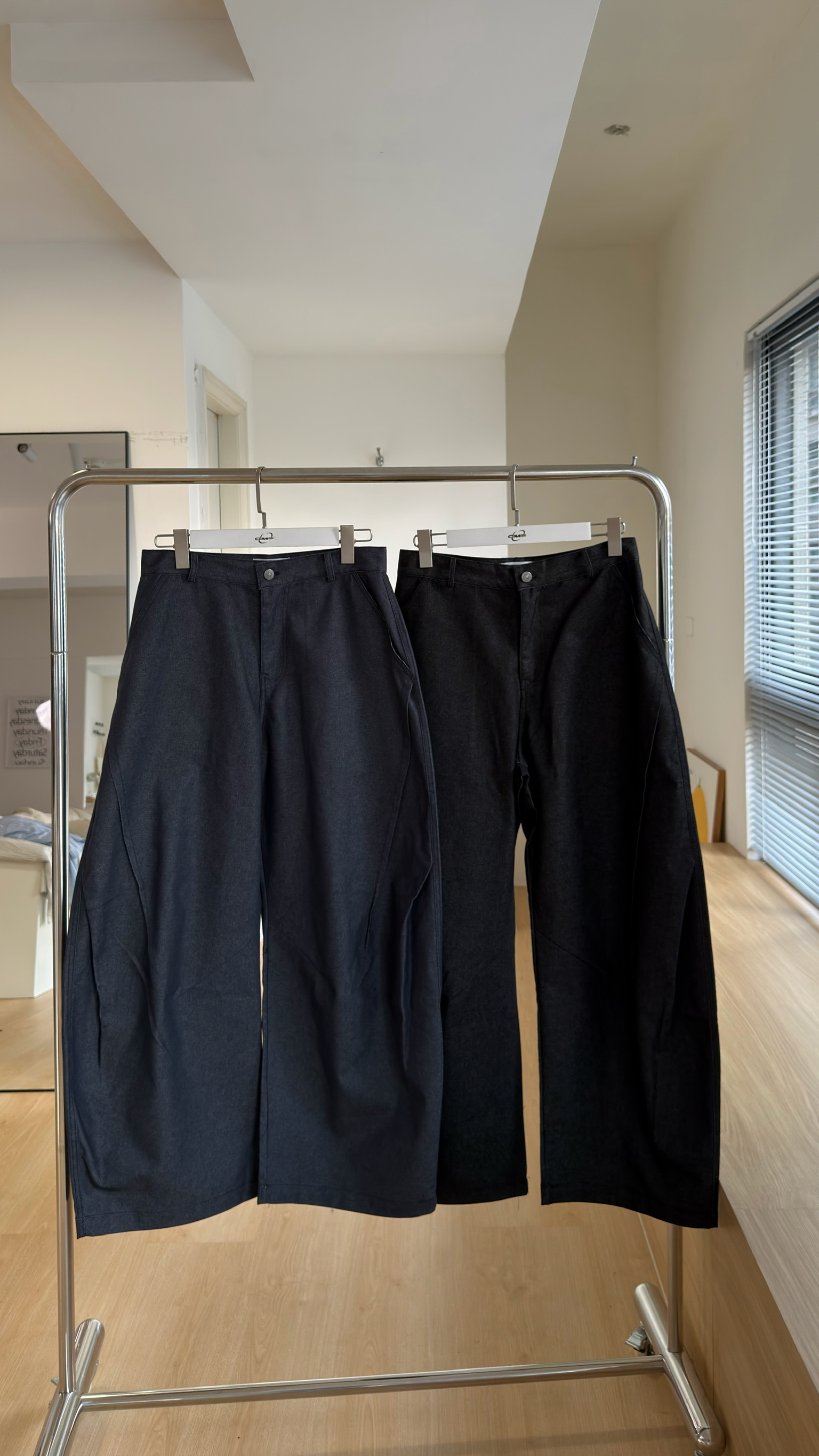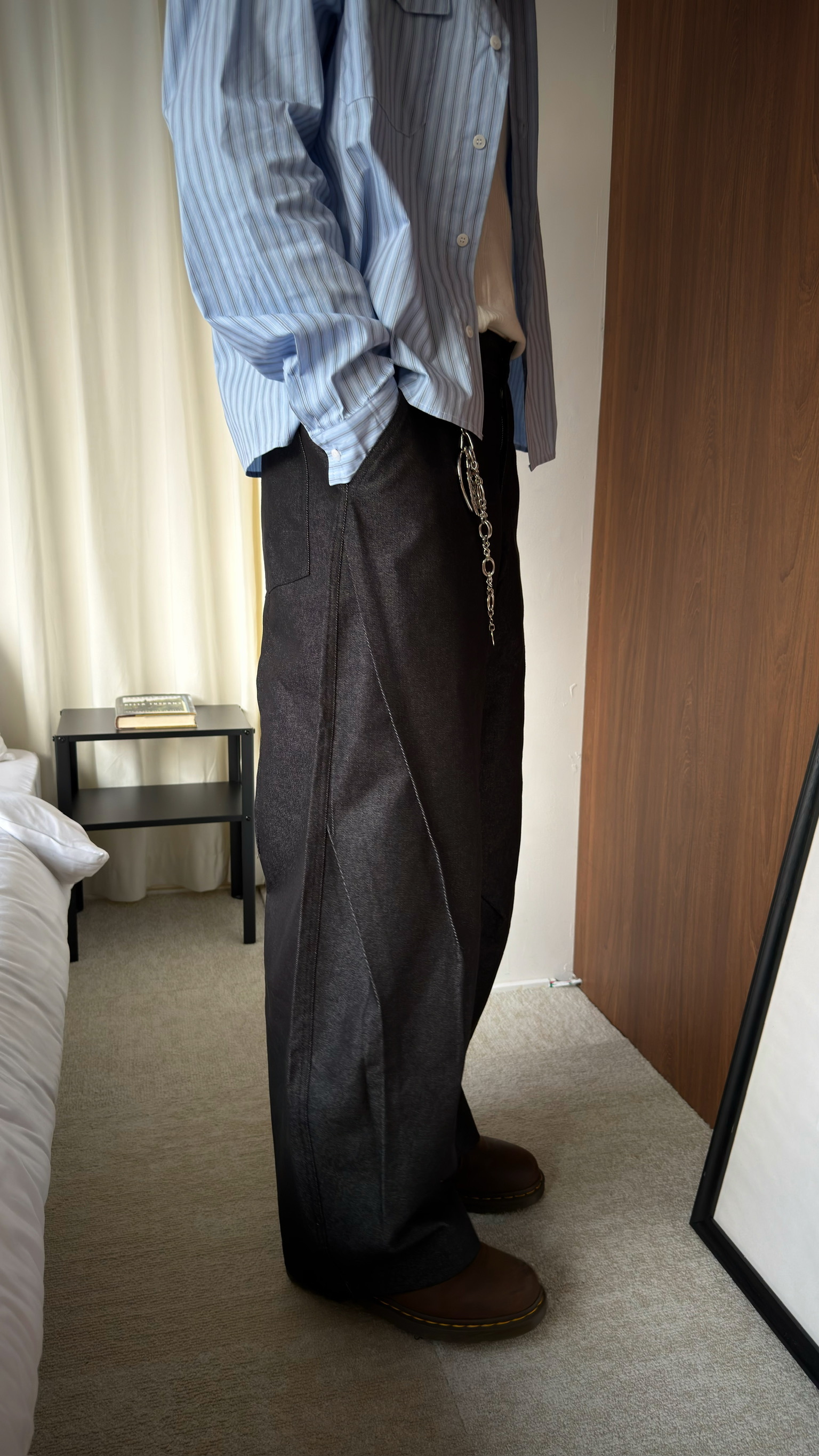 闊腿側立體抓皺丹寧褲